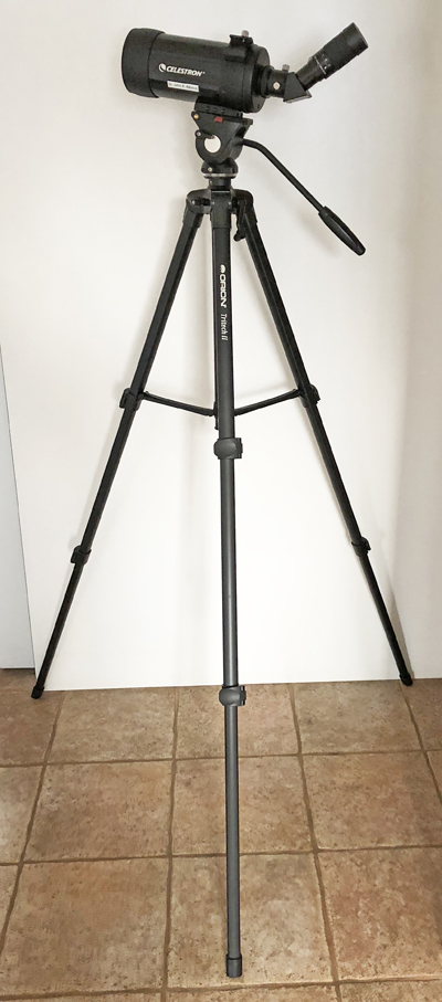 Celestron C90, 90 mm (3.5 inch) x 1250 mm Maksukov (OTA = 4.6 pounds) on an Orion Tritech II Fluid Head Tripod (4.8 pounds) (2018)